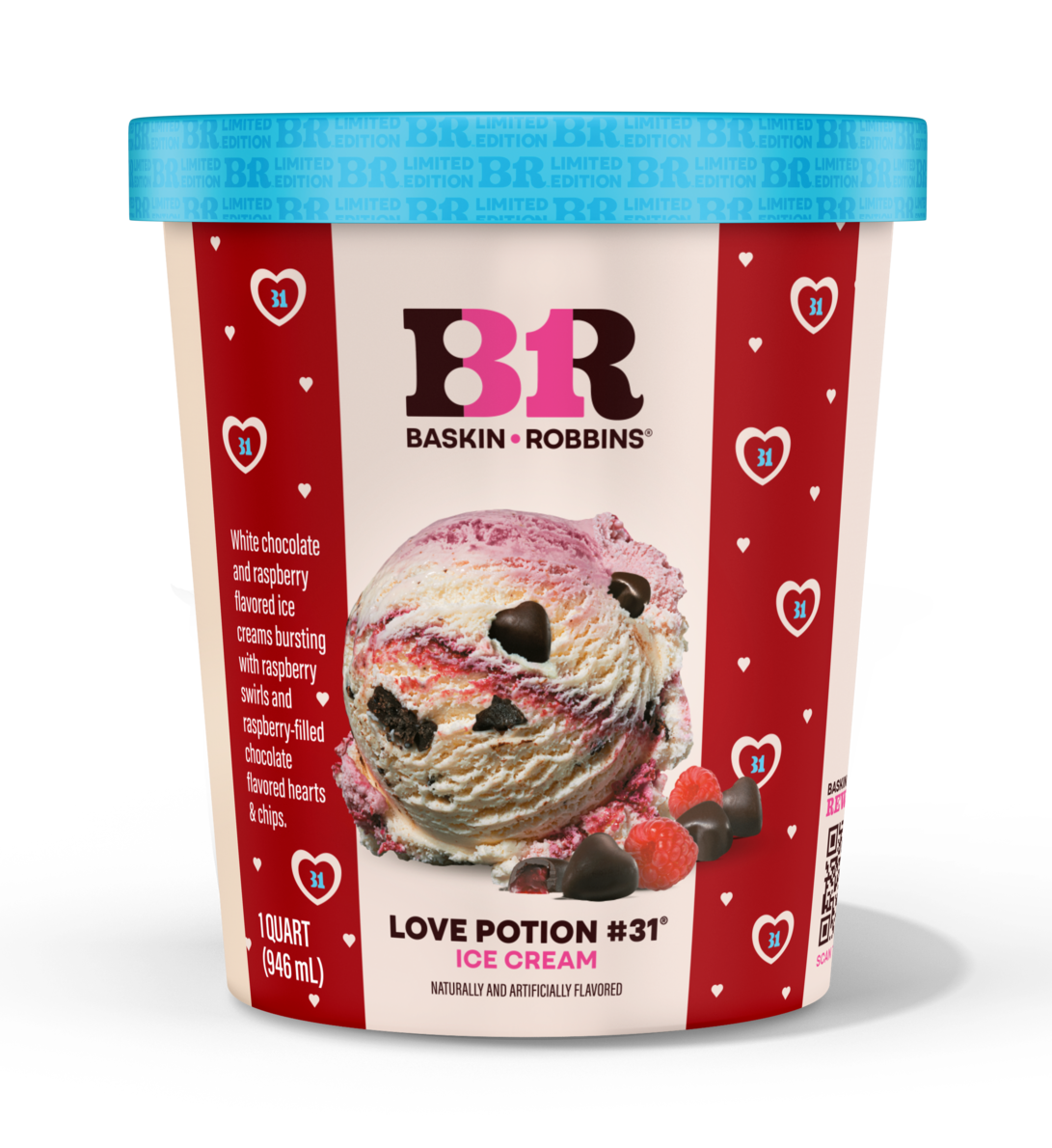 White Chocolate & Raspberry flavored Ice Creams bursting with Raspberry-Filled Chocolate flavored Hearts, Raspberry Swirls & Chocolate flavored Chips.